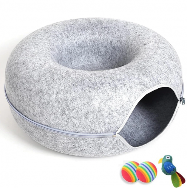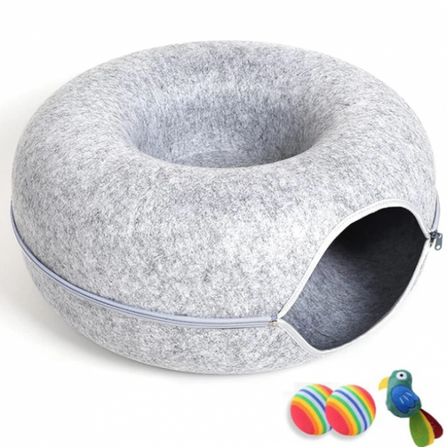 Cat Cave for Indoor Cats, Large Donut Tunnel Bed, Peekaboo Cave With 3 Toys, Scratch Resistant Bed for Cats up to 24 Lbs